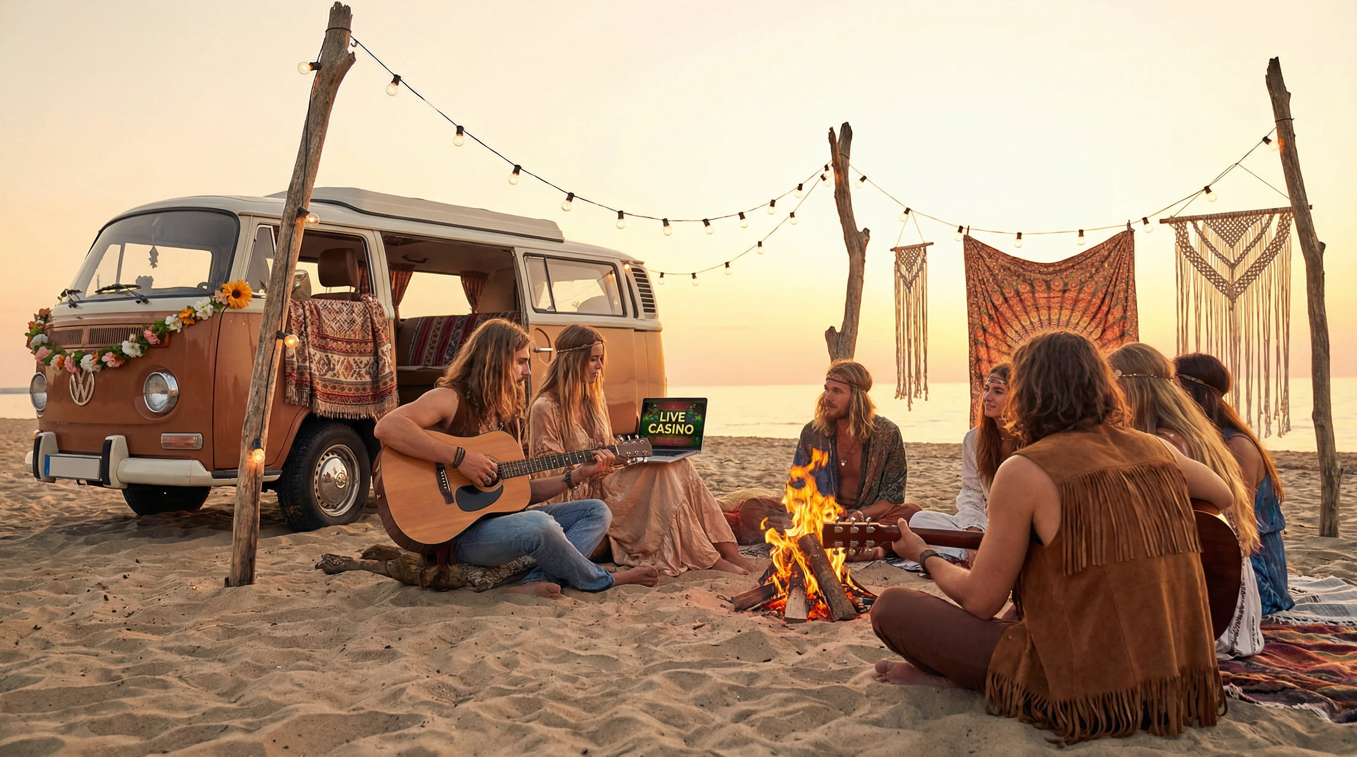 波西米亚荷官嬉皮士牌桌音乐节荷官派对环球旅行荷官手工艺宝丽来伍德斯托克帐篷自由微笑浪漫牌局流苏串灯捕梦网装饰吉他旋律房车营地